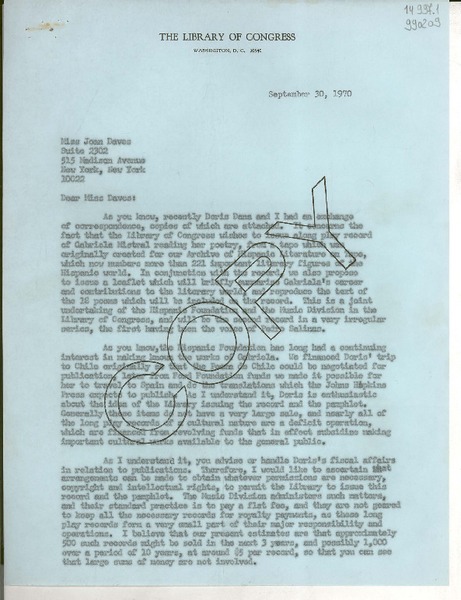 [Carta] 1972 Feb. 29, Catedrático de Música, Raimundo F. Villaverde, 15, Madrid 3, Spain [a] Ms. Joan Daves, New York, U.S.A. [manuscrito] Ma Pilar Escudero.