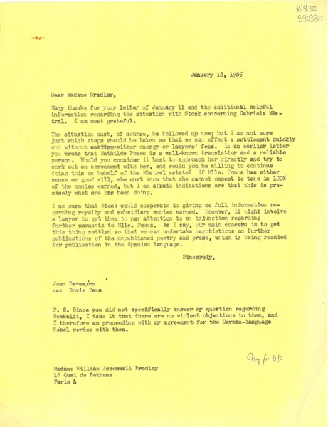 [Carta] 1961 Jan. 27, [EE.UU.] [a] Joan [Daves], [EE.UU.] [manuscrito] [Doris Dana].