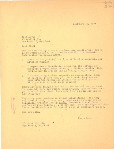[Carta] 1958 Feb. 11, New York, [Estados Unidos] [a] Joan Daves, 15 East 48 St., New York [manuscrito] Doris Dana.