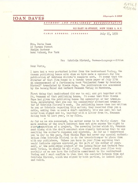 [Carta] 1956 July 25, 112 East 19 Street, New York 3, N. Y., [EE.UU.] [a] Mrs. Doris Dana, 15 Spruce Street, Roslyn Harbour, Lond [i.e. Long] Island, New York, [EE.UU.] [manuscrito] Joan [Daves].