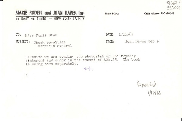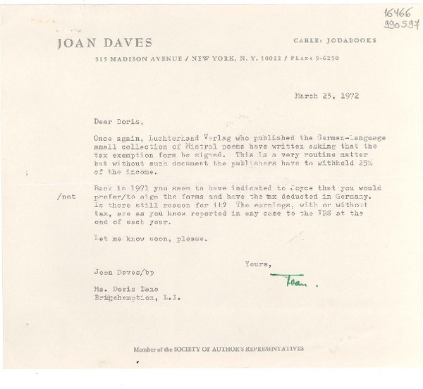 [Recibo] 1972 May 23, New York, N. Y., [EE.UU.] [a] Doris Dana, Hildreth Lane, Bridgehampton, Long Island, New York, [EE.UU.] [manuscrito] Joan Daves.