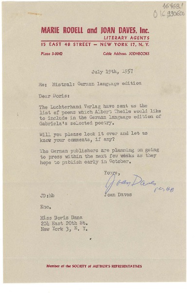 [Carta] 1957 July 19, New York, [Estados Unidos] [a] Miss Doris Dana, 204 East 20th St., New York [manuscrito] Joan Daves.