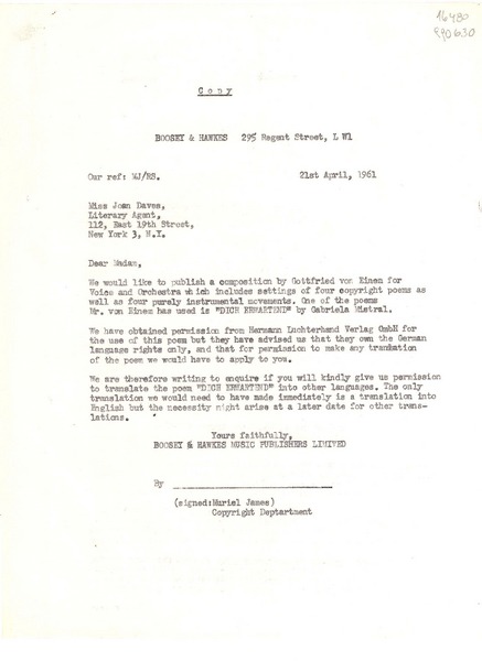 [Carta] 1961 Apr. 21, Boosey and Hawkes, 295 Regent Street, L W.1., [England] [a] Miss Joan Daves, Literary Agent, 112, East 19th Street, New York 3, N. Y., [EE.UU.] [manuscrito] Muriel James.