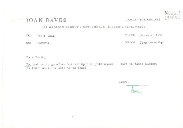 [Carta] 1974 Mar. 7, [New York, Estados Unidos] [a] Doris Dana [manuscrito] Joan Daves.