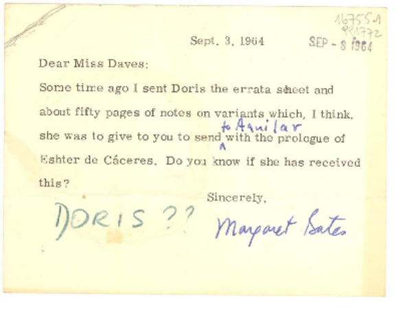 [Tarjeta] 1964 Sept. 3, Washington D. C., [EE.UU.] [a] Dear Miss Daves [manuscrito] Margaret Bates.