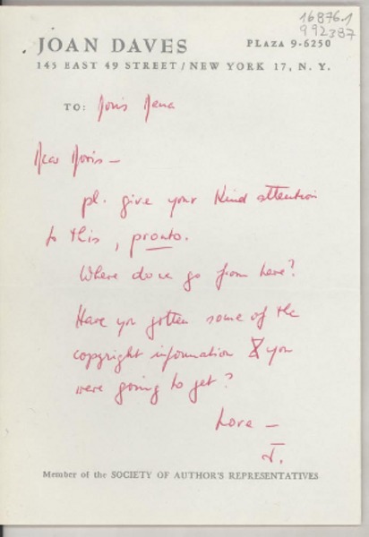 [Carta] 1956 Nov. 16, Joan Daves, 112 East 19th Street, New York 3, N. Y., [EE.UU.] [a] Mrs. Doris Dana, 15 Spruce Street, Roslyn Harbour, Long Island, New York, [EE.UU.] [manuscrito] Joan Daves.