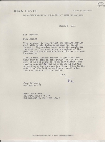 [Carta] 1971 Mar. 3, [New York, Estados Unidos] [a] Miss Doris Dana, Hildreth Lane Box 188, Bridgehampton, New York [manuscrito] Joan Daves.
