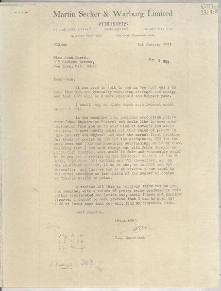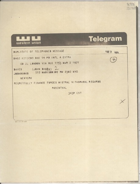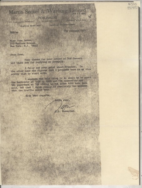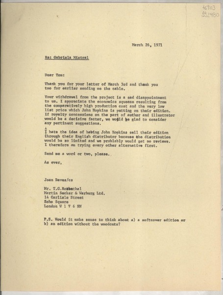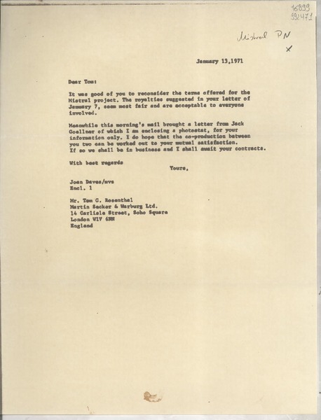 [Carta] 1971 Mar. 26, [Estados Unidos] [a] Mr. T. G. Rosenthal, London [manuscrito] Joan Daves.