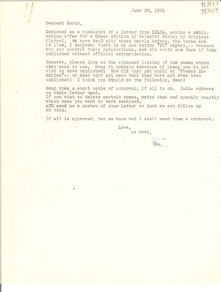 [Carta] 1961 June 20, [New York, Estados Unidos] [a] Dearest Doris [manuscrito] Joan Daves.