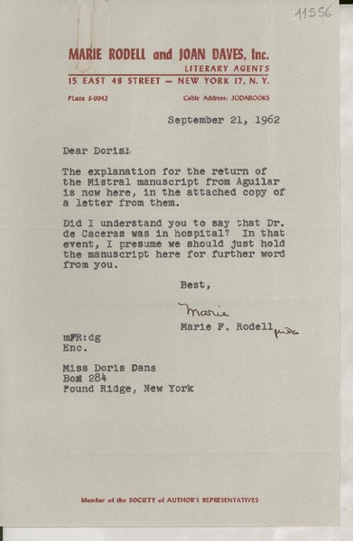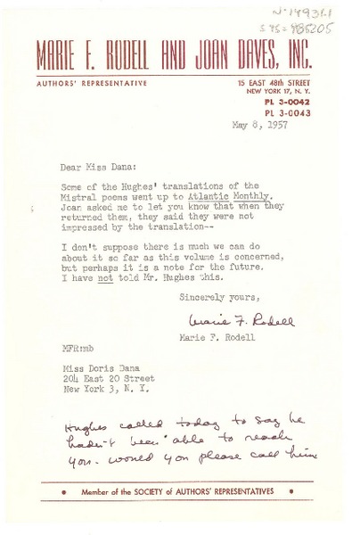 [Carta] 1957 may 8, [New York, Estados Unidos] [a] Doris Dana, New York, [Estados Unidos] [manuscrito] Marie F. Rodell.