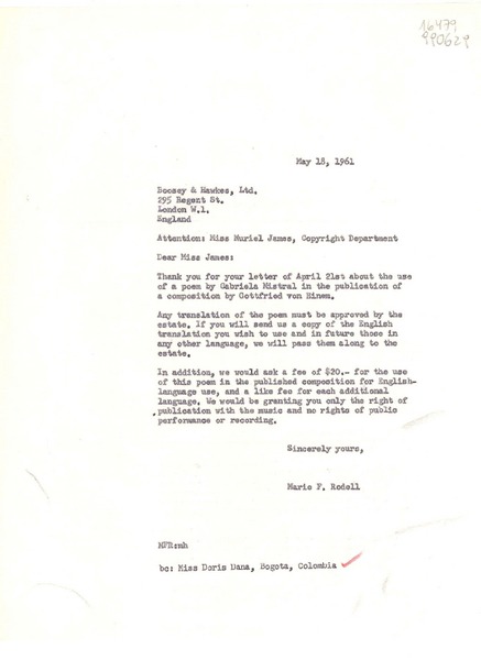 [Carta] 1961 May 18, [EE.UU.] [a] Boosey and Hawkes, Ltd., 295 Regent St., London, W.1., England [manuscrito] Marie F. Rodell.