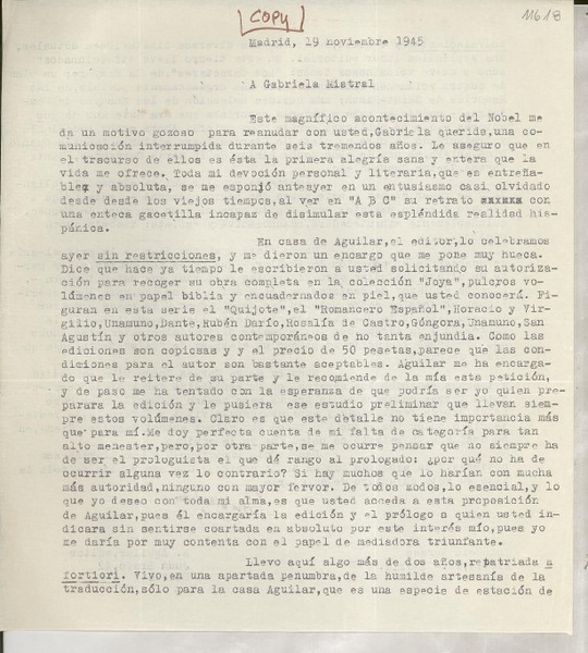 [Carta] 1945 nov. 19, Madrid, [España] [a] Gabriela Mistral [manuscrito] Consuelo Berges, M. Aguilar.