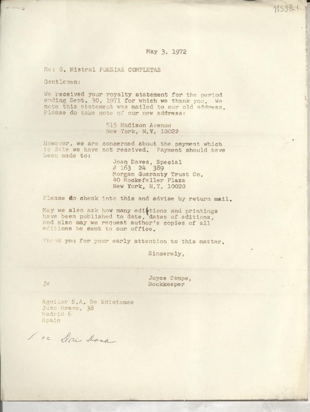 [Carta] 1972 mayo 3, [New York, Estados Unidos] [a] Aguilar S. A. de Ediciones, Juan Bravo 38, Madrid, Spain [manuscrito] Joyce Campe.