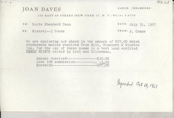 [Recibo] 1967 July 31, [New York], [EE.UU.] [a] Doris Shepherd Dana, [EE.UU.] [manuscrito] J. Campe.