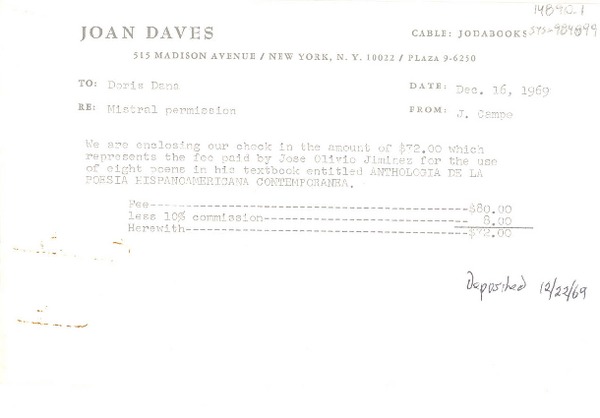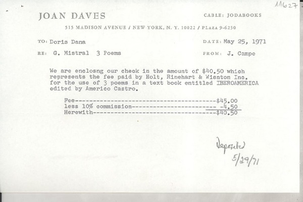 [Recibo] 1972 Apr. 11, 515 Madison Avenue, New York, N.Y. 10022, Plaza 9-6250, [EE.UU.] [a] Doris Dana [manuscrito] J. Campe.