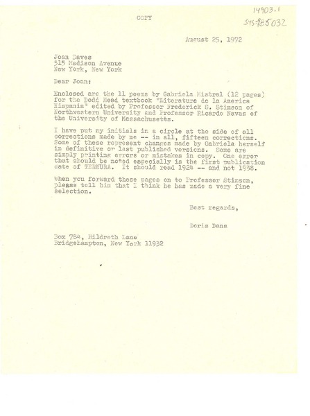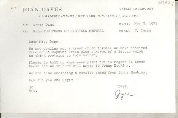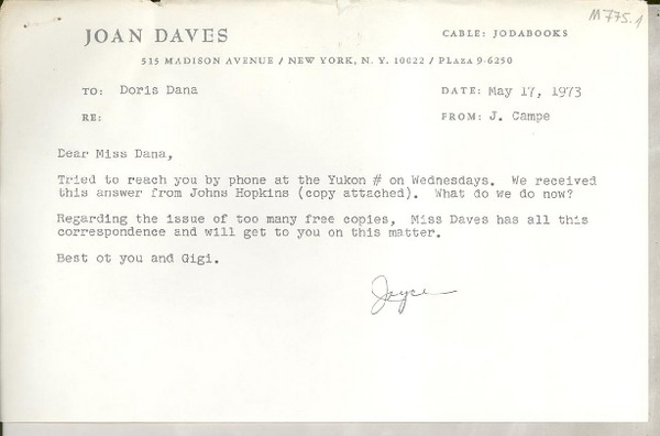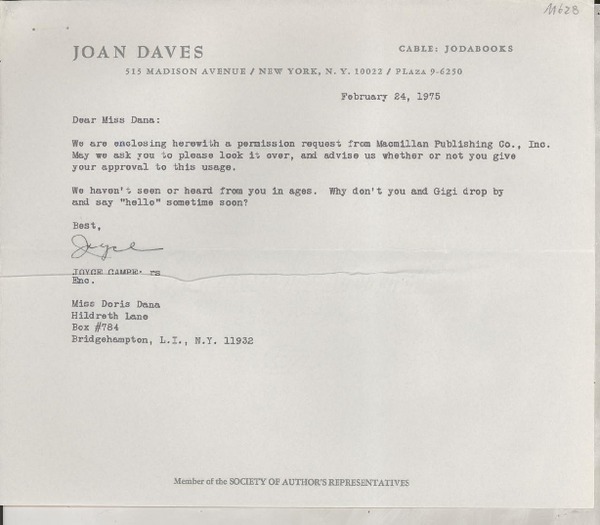 [Carta] 1976 Oct. 21, 515 Madison Avenue, New York, N. Y. 10022, [EE.UU.] [a] Ms. Doris Dana, Hildreth Lane, Box #784, Bridgehampton, L. I., N.Y. 11932, [EE.UU.] [manuscrito] Joan Daves, Joyce Campe.
