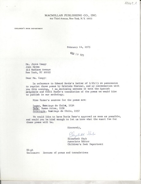[Carta] 1975 Feb. 14, New York, [EE.UU.] [a] Ms. Joyce Campy [i.e. Campe], New York, [EE.UU.] [manuscrito] Elizabeth Shub.