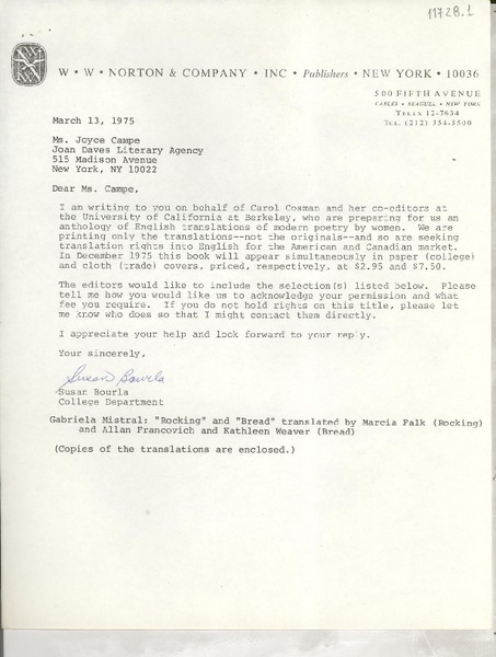 [Carta] 1975 Mar. 13, [New York, Estados Unidos] [a] Ms. Joyce Campe, Joan Daves literary Agency, 515 Madison Avenue, New York, NY [manuscrito] Susan Bourla.
