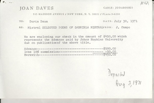 [Carta] 1971 Aug. 24, 515 Madison Avenue, New York, N. Y. 10022, Plaza 9-6250, [EE.UU.] [a] Miss Doris Dana, [EE.UU.] [manuscrito] J. Campe.