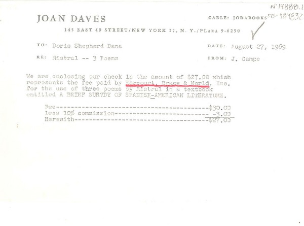 [Carta] 1969 dec. 16, [New York, Estados Unidos] [a] Doris Dana [manuscrito] J. Campe.