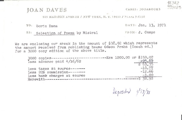 [Recibo] 1971 May 25, New York, [EE.UU.] [a] Doris Dana, [EE.UU.] [manuscrito] J. Campe.