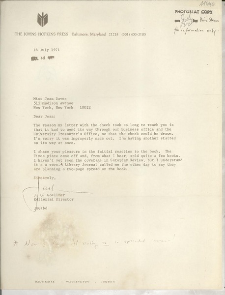 [Carta] 1971 July 16, Baltimore, Maryland, [EE.UU.] [a] Miss Joan Daves, New York, New York, [EE.UU.] [manuscrito] J. G. Goellner.