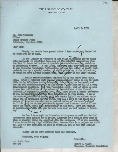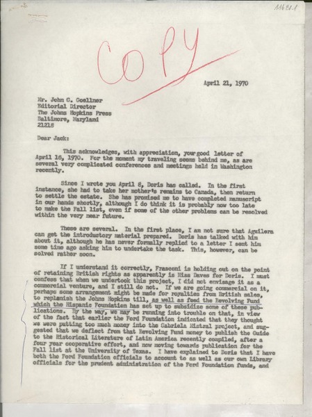 [Carta] 1970 Apr. 21, Hispanic Foundation, [EE.UU.] [a] Mr. John G. Goellner, Editorial Director, The Johns Hopkins Press, Baltimore, Maryland, [EE.UU.] [manuscrito] Howard F. Cline.