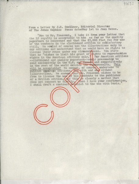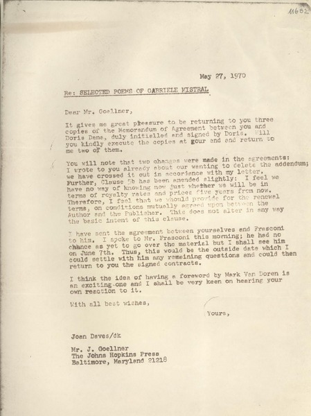 [Carta] 1970 May 27, [EE.UU.] [a] Mr. J. Goellner, The Johns Hopkins Press, Baltimore Maryland, [EE.UU.] [manuscrito] Joan Daves.