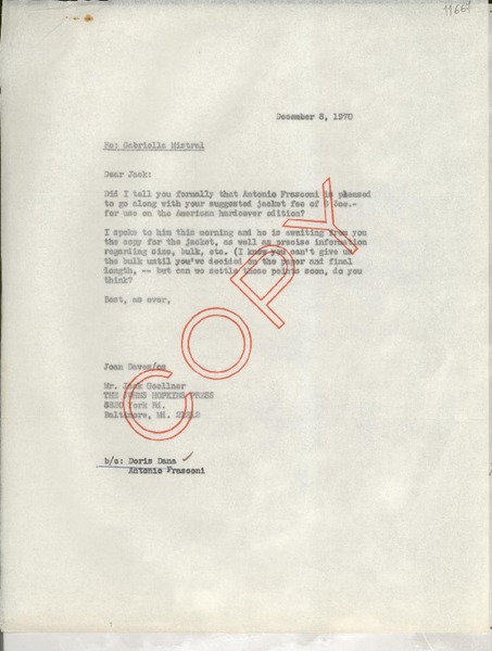 [Carta] 1970 Dec. 8, [Estados Unidos] [a] Mr. Jack Goellner, The Johns Hopkins Press, Baltimore, Mi. [manuscrito] Joan Daves.