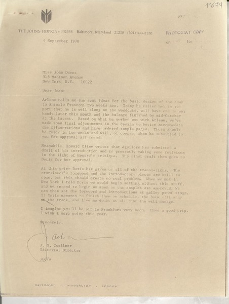 [Carta] 1970 Sept. 16, [Estados Unidos] [a] Mr. J. G. Goellner, The Johns Hopkins Press, Baltimore, Maryland. [manuscrito] Joan Daves.