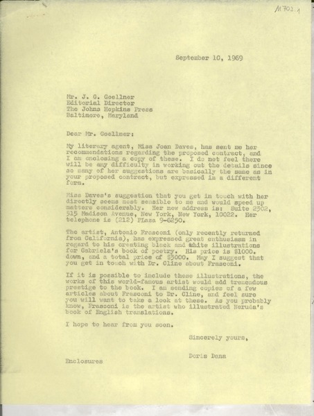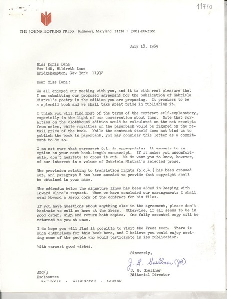 [Carta] 1969 Sept. 10, [EE.UU.] [a] Mr. J. G. Goellner, Editorial Director, The John Hopkins Press, Baltimore, Maryland, [EE.UU.] [manuscrito] Doris Dana.