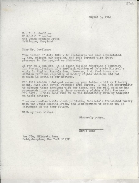 [Carta] 1969 Aug. 5, Box 784, Hildreth Lane, Bridgehampton, New York, [Estados Unidos] [a] Mr. J. G. Goellner, Editorial Director The Johns Hopkins Press, Baltimore, Maryland [manuscrito] Doris Dana.
