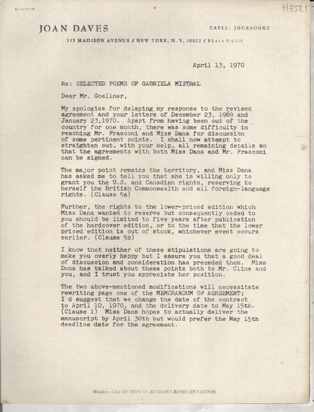 [Carta] 1970 Apr. 13, [New York, Estados Unidos] [a] Mr. J. G. Goellner, The Johns Hopkins Press, Baltimore, Maryland [manuscrito] Joan Daves.