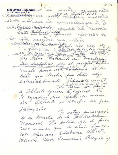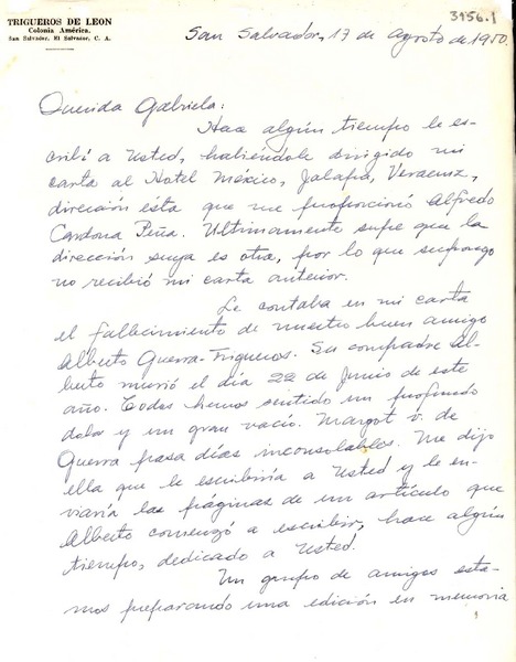 [Carta] 1948 ago. 28, San Salvador, El Salvador [a] Gabriela Mistral, Santa Bárbara, California [manuscrito] Trigueros de León.