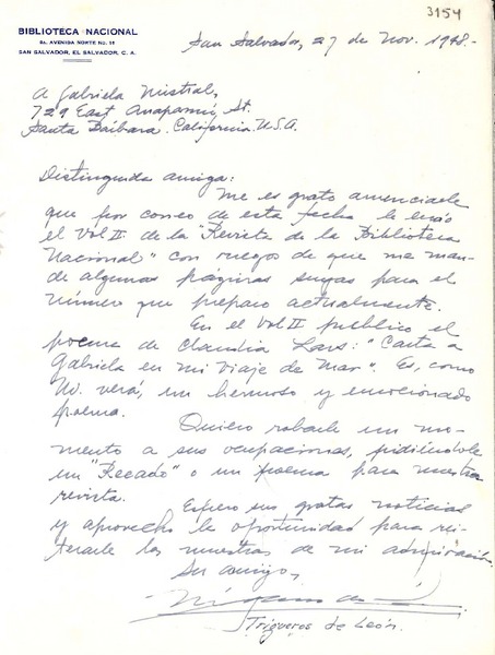 [Carta] 1948 nov. 29, San Salvador [a] Gabriela Mistral, Santa Bárbara, California [manuscrito] Trigueros de León.