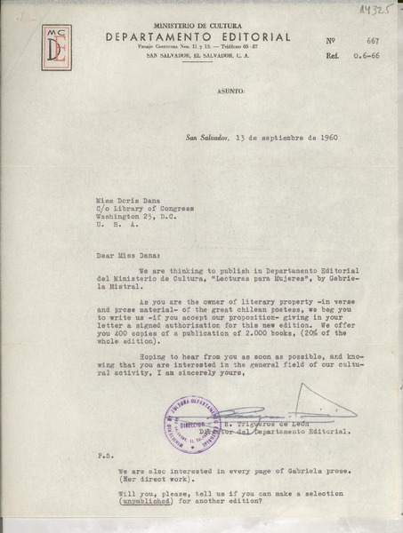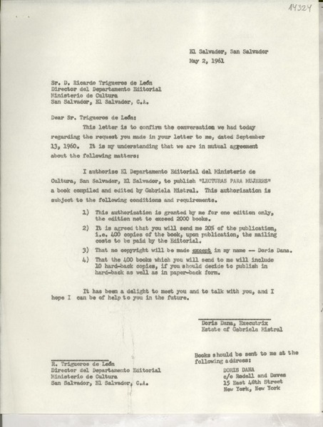 [Carta] 1961 May 2, San Salvador, El Salvador [al] Sr. D. Ricardo Trigueros de León, Director del Departamento Editorial, Ministerio de Cultura, San Salvador, El Salvador, C.A. [manuscrito] Doris Dana.