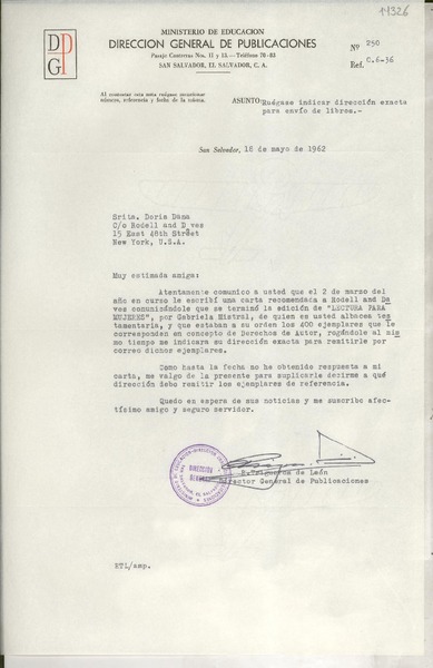 [Carta] 1962 mayo 18, San Salvador, [El Salvador] [a] Srita. Doris Dana, New York, U. S. A. [manuscrito] R. Trigueros de León.