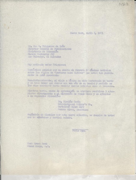 [Carta] 1963 abr. 8, Nueva York, [Estados Unidos] [a] Sr. Don R. Trigueros de León, Director General de Publicaciones, Ministerio de Educación, San Salvador, El Salvador [manuscrito] Doris Dana.