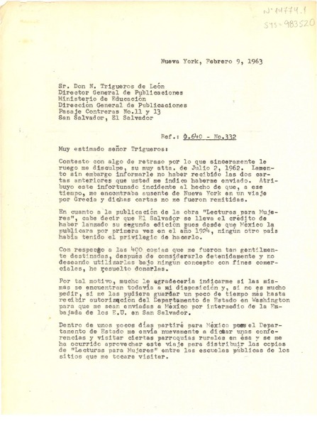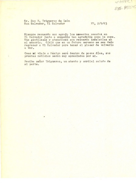 [Carta] 1963 feb. 9, Nueva York, [Estados Unidos] [a] N. Trigueros de León, Director General de Publicaciones, Ministerio de Educación, San Salvador, El Salvador [manuscrito] [Doris Dana].