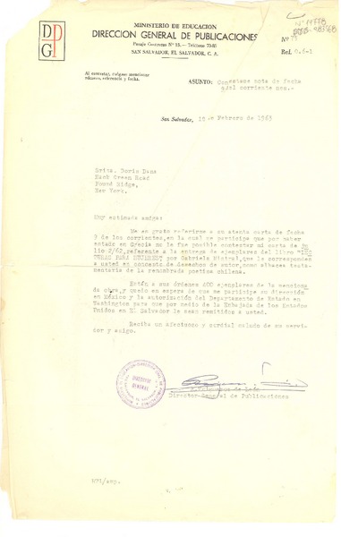 [Carta] 1963 feb. 18, San Salvador, [El Salvador] [a] Doris Dana, Pound Ridge, New York, [Estados Unidos]. [manuscrito] N. Trigueros de León, Director General de Publicaciones.