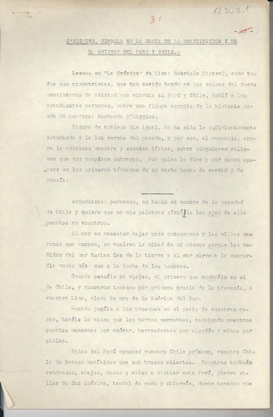 O'Higgins, símbolo en la gesta de la emancipación y de la amistad del Perú y Chile [artículo] Gabriela Mistral.