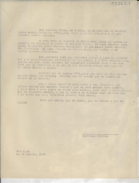 [Hoy celebra Chile ...] [manuscrito] Gabriela Mistral.