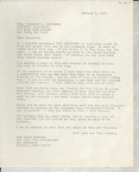 [Carta] 1973 Jan. 1, [EE.UU.] [a] Mrs. Margaret K. McElderry, Atheneum Publishers, 122 East 42nd Street, New York, New York, [EE.UU.] [manuscrito] [Doris Dana].