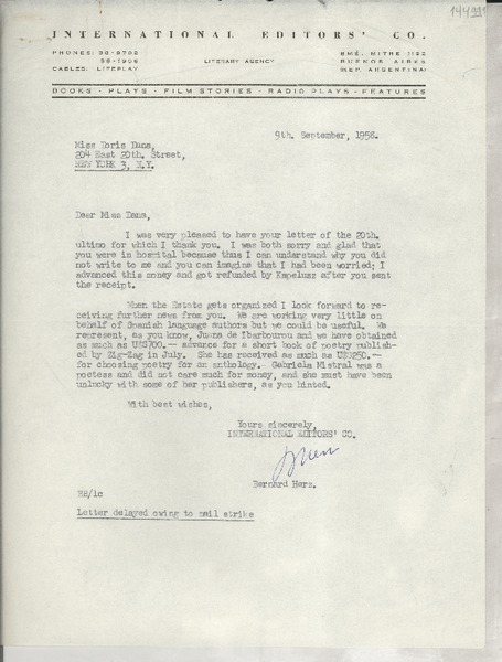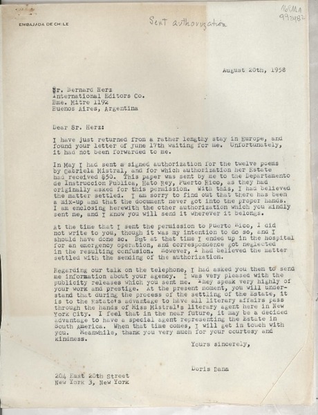 [Carta] 1958 Aug. 20, 204 East 20th Street, New York 3, New York, [EE.UU.] [al] Sr. Bernard Herz, International Editors Co., Bme. Mitre 1192, Buenos Aires, Argentina [manuscrito] Doris Dana.