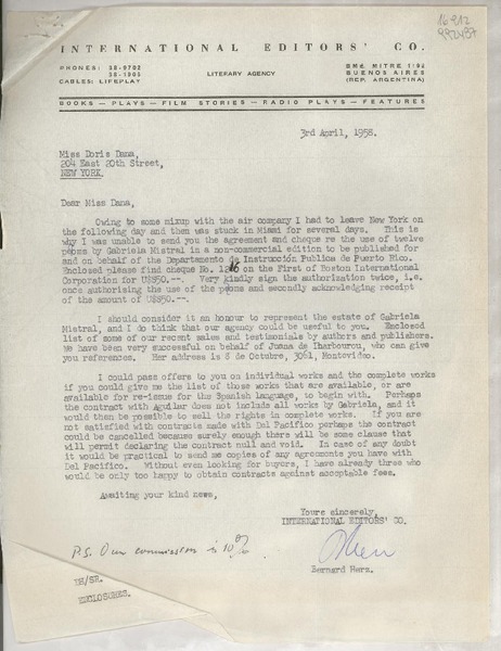 [Carta] 1958 Apr. 3, Bmé. Mitre 1192, Buenos Aires, Rep. Argentina [a] Miss Doris Dana, 204 East 20th Street, New York, [EE.UU.] [manuscrito] Bernard Herz.