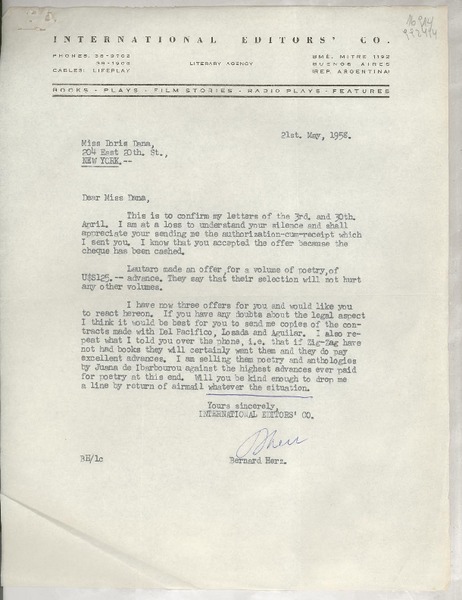 [Carta] 1958 May 21, Bmé. Mitre 1192, Buenos Aires, Rep. Argentina [a] Miss Doris Dana, 204 East 20th St., New York, [EE.UU.] [manuscrito] Bernard Herz.
