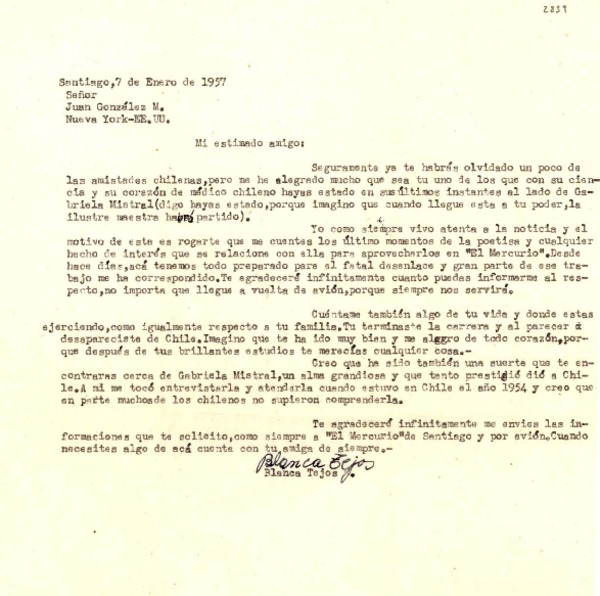 [Carta] 1957 ene. 7, Santiago [a] Juan González M., Nueva York [manuscrito] Blanca Tejos M.