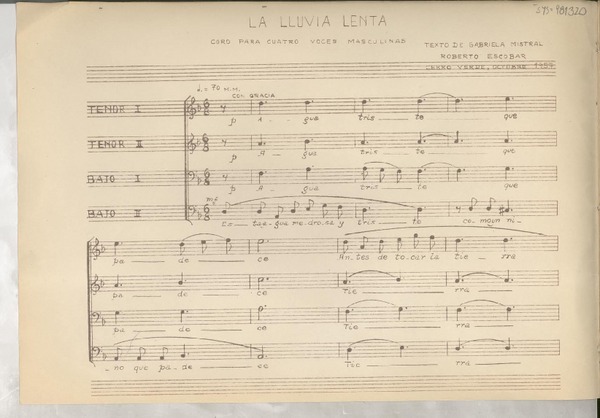 La lluvia lenta coro para cuatro voces masculinas [música] : Roberto Escobar ; texto de Gabriela Mistral.