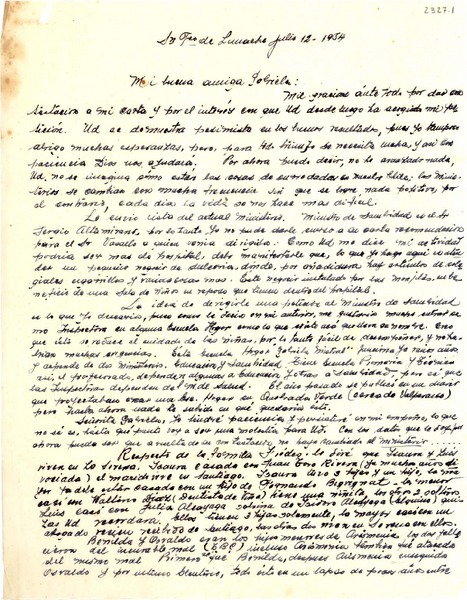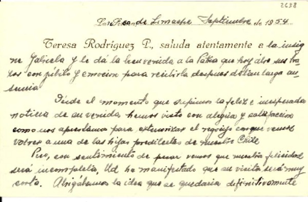 [Carta] 1954 jul. 12, San Francisco de Limache, [Chile] [a] Gabriela [Mistral] [manuscrito] Teresa Rodríguez P.