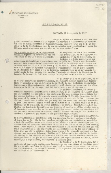 Circular N° 67, 1947 oct. 22, Santiago, [Chile] Declaración oficial de la Presidencia sobre la ruptura de relaciones con los Gobiernos de Rusia y Checoeslovaquia [manuscrito] : El Ministro [Germán Vergara Donoso].